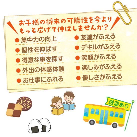 授業の終了後又は学校の休業日に、放課後等デイサービスに通わせ、生活能力の向上のために必要な支援、社会との交流の促進その他必要な支援を行います。
